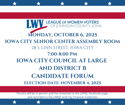 The Johnson County League of Women Voters invites you to learn firsthand about the candidates running in the November 4, 2025 election for the Iowa City Council.