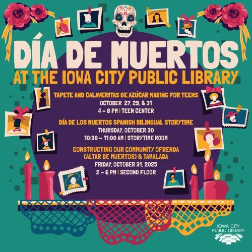 The community ofrenda at the Iowa City Public Library is an offering showcasing a remembrance of those no longer with us. We celebrate their lives and commemorate their spirit through candles, their favorite foods, flowers, and photographs.