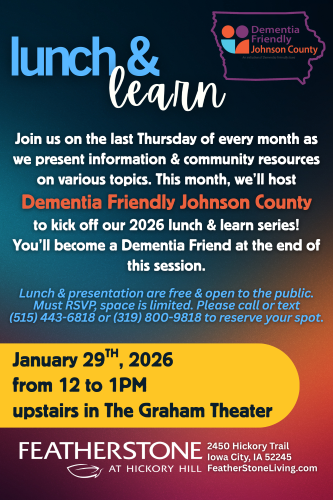 FeatherStone at Hickory Hill invites you to attend the first of its 2026 Lunch & Learn series with a presentation by Dementia Friends Johnson County. At the end of this Lunch & Learn, each attendee will become a “Dementia Friend”!