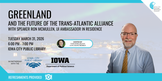 The Iowa City Foreign Relations Council and the UI Department of Political Science invite you to attend a timely community conversation with former U.S. Ambassador Ron McMullen. He will examine U.S.-Danish relations, America’s strategic interests in Greenland, his view of the future of the transatlantic alliance, and what these developments mean for NATO and global stability.