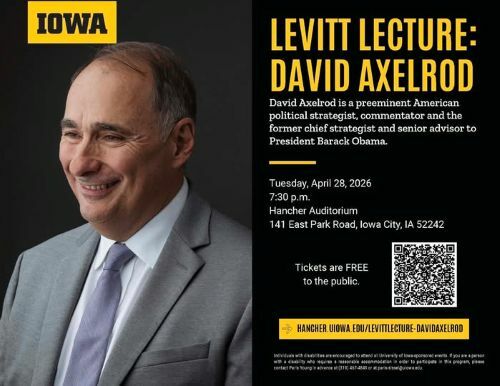 David Axelrod, a preeminent American political commentator and former chief strategist and senior advisor to President Barack Obama, will speak at Hancher Auditorium as the Spring 2026 Levitt Lecturer, hosted by the UI College of Law.