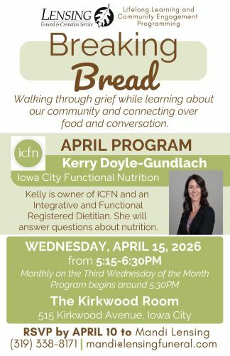 This month’s discussion features a presentation by Kerry Doyle-Gundlach, owner of Iowa City Functional Nutrition and an Integrative and Functional Registered Dietician. She will bring insight into nutrition and caring for yourself in the midst of grief and loss.